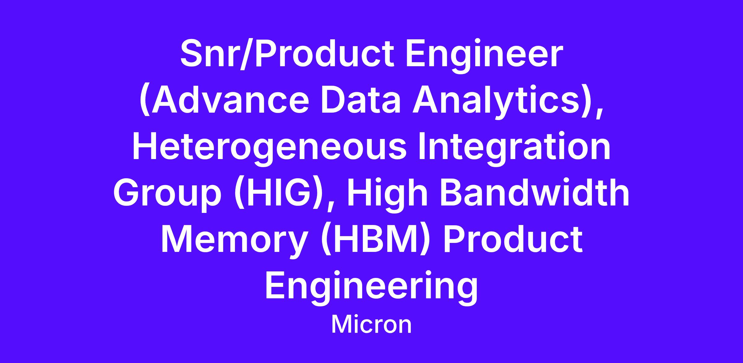 Snr/ Product Engineer (Advance Data Analytics), Heterogeneous Integration Group (HIG), High Bandwidth Memory (HBM) Product Engineering